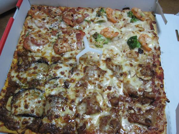 で自分が頼んだのはこちら。4種類のピザがひとつになったピザと、チキンボックスのセット。