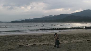 で、まずは城山公園前に駐車。こちらも駐車場が広くなっていたり、温水シャワーが設置されていたりと、2年来ていないうちに便利になっていますね~。そのためか、波をチェックしに海を見に行ってみると、サーファーがいっぱい(汗