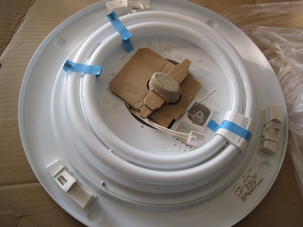 実際は蛍光灯の問題かなぁと思って新しいのに取り換えたりしたんですが、点滅が改善されず。ってことで新しい照明器具の購入に踏み切ったわけです。新しい蛍光灯も買ったのに、もったいない・・・。