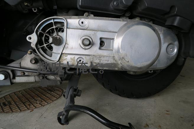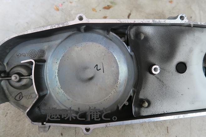 クランクケースの内側は黒い粉がいっぱい。Vベルトの粉塵でしょうねぇ。