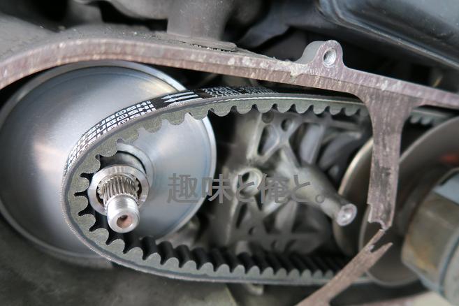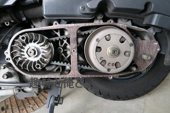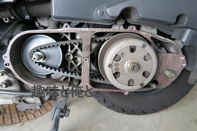 クラッチを外したら、Vベルトを取り外します。今回はガスケットの真ん中の部分だけをちぎって取り外しました。とりはずしたVベルトは目立ったひび割れ等がある気配はなし。まだまだ乗っても大丈夫そうでしたね。太さは18mmほどでした。ノギスが見つからなかったので、メジャーで測定したので正確ではありませんが・・・。