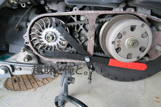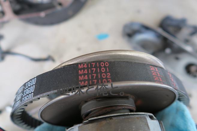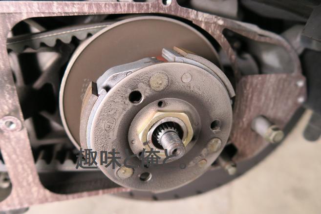 さて、あとは組み付け。まずはブレーキクリーナーでVベルトが当たる所を脱脂。クラッチ側に少しVベルトを挟みこみ、クラッチと一緒にVベルトをクランクケースに取り付けます。