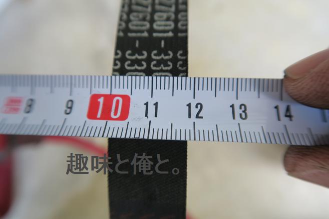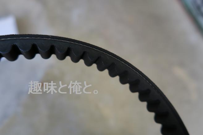 新しく取り付ける台湾スズキ製の純正Vベルト。新品はやっぱり綺麗ですね~。太さは19mmほど。そう考えると1mmほどすり減っていたんですね~。