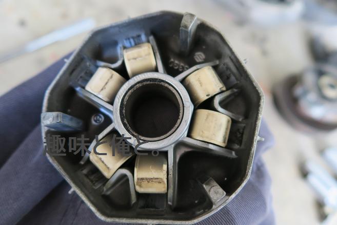 ついでにプーリーも取り外してみると・・・、ウエイトローラーも部分的に削れていました。けど、今回は用意していないので交換なしで。Vベルトと一緒に交換すると効率がいいですね。