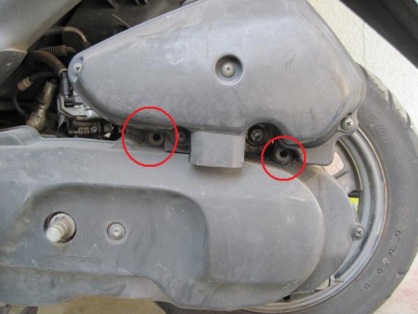 続いてエアクリーナーボックスをはずす。ギアボックスと固定する為のネジを2つ取り外して、あとはキャブレターとエアクリボックスを固定しているバンドを外すだけ。