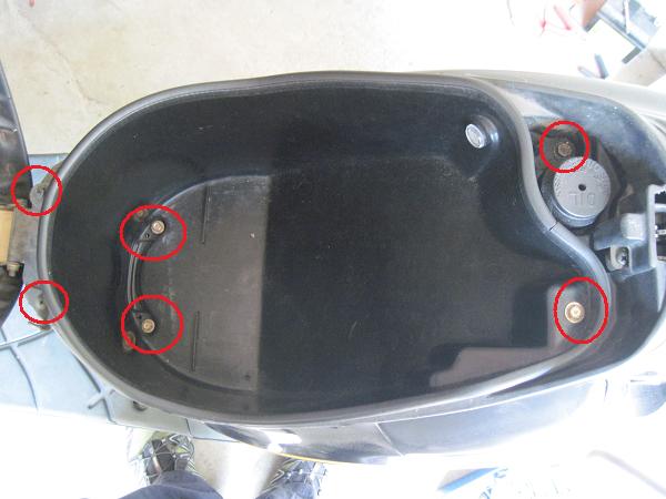 今度はシート下のメットインボックスを取りはずす。たしかネジとボルト計6本を取ればいいだけだったと思います。メットインの電球の配線のカプラーをはずさないと完全にはとれません。