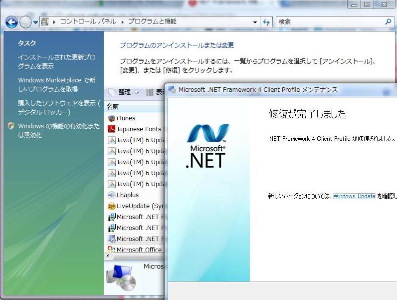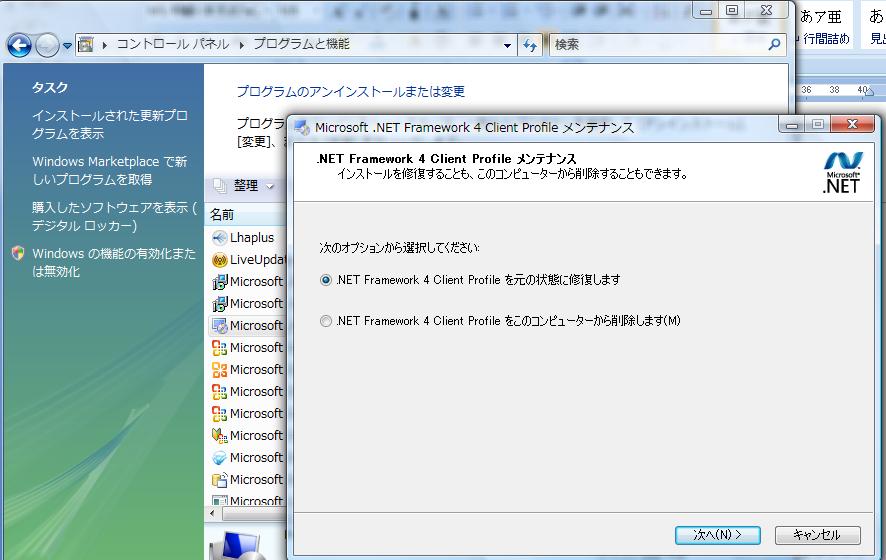 何をしたかというと、『コントロールパネル』→『プログラムと機能』→そこのインストールされているプログラム一覧から『Microsoft .NET framework client profile』をダブルクリック→『修復』を選択。しばらくまって修復完了後にもう一度更新情報のインストールをしてみたところ、無事にインストールに成功しました。