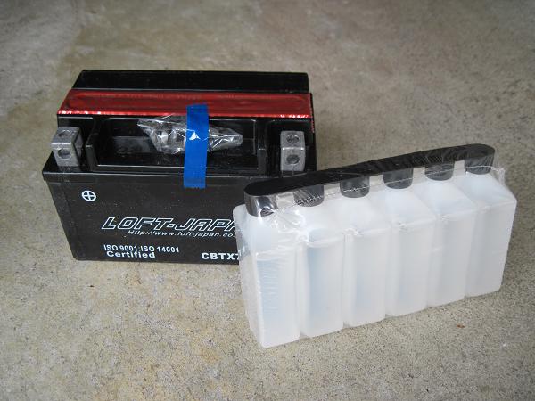 ポコポコと泡があがってきてバッテリー液が容器側に流れているのを確認してから20分程放置。もし泡が上がってこないもしくは液が容器に入っていっていない場合はバッテリー液側の容器を軽く叩いたりつまんだりしてください。決してバッテリー液を容器から抜かないように。この20分ぐらいの間は化学反応が起きていて水素ガス等が発生しているらしいので、換気の良いところで作業をしないと発火の恐れがあります。また、20分待たずにふたを閉めると発生したガス等で容器内の圧力が高まって液が吹き出る恐れもあるようです。ちなみにバッテリー液は人体に有毒です。