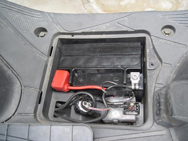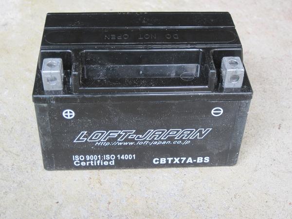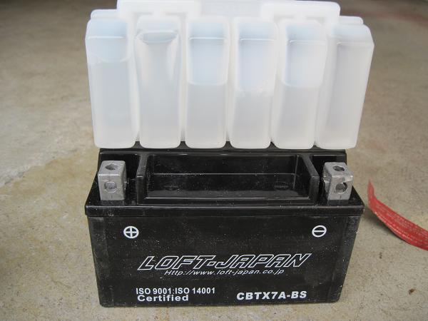 あとは古いバッテリーを取り外して新しいのと取り換えるだけです。新しいバッテリーの容器に黒いキャップ(バッテリー液についていたやつ)を取り付けます。このキャップ、結構硬いんですが、全体的にまんべんなく押さえて少しずつ差し込んでいきましょう。