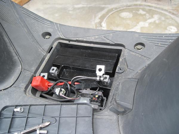 20分待っている間にバッテリー交換の準備。バッテリーは足元に収納されています。六角レンチでねじを緩めてカバーを取るとバッテリーがあります。