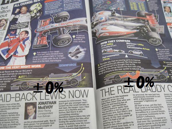 それはそうとマクラーレンのフロントノーズについているダクトの解説が新聞に載ってました。通常走行時はダクトを通ってリアウイングの下方にも気流が抜けるのでダウンフォースが発生しやすく、グリップ力アップ。逆にドライバーがコックピット内で足を使って穴をふさぐと気流はダクトを抜けずにそのままスルッとマシンに沿って抜けていくので、抵抗がなくなりスピードがアップするようです。これをドライバーがコーナーと直線で使い分けることでアドバンテージが得られるという仕組みのようです。