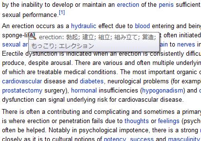 さっきもそんな機能をフル活用しながら、課題に取り組んでいたわけです。ちなみに今の課題の内容はED(インポ)についてまとめることです。勃起不全というやつですね。で、情報収集中に”erection”という単語にマウスを合わせて訳をチェックしていたら・・・