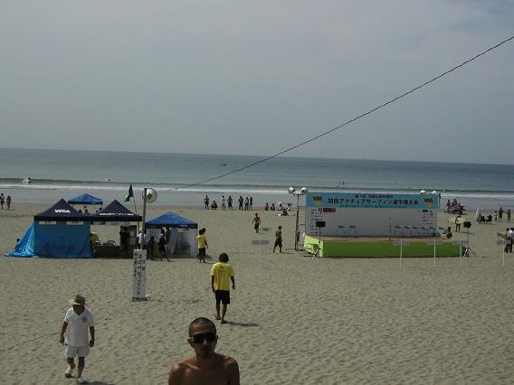 せっかく来たし俺も着替えて混雑の中へGO!!と思ったらビーチサンダルを持ってくるの忘れてた・・・。まぁいっかと思って裸足でビーチに入ったら、砂が熱いのなんのって(汗)あわててダッシュして海に向うもサーフィン大会が開催されていて両端まで距離が遠い(汗)つま先走りでなんとか海に到着したころにはしっかりと足の裏を火傷してました(泣)靴ずれみたいな水ぶくれが足の裏に数箇所できててかなりヒリヒリするなか、3時間ぐらいサーフィンして終了。波乗りの方はテイクオフはするもののダンパー気味の波ですぐに終了ってな感じです。たまにいい波が来てもロングの人に取られて見守るだけ・・・。