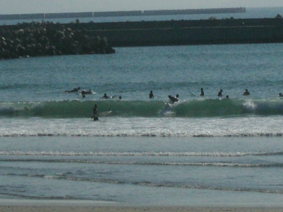 磯の浦にはお昼過ぎに到着。やはり混雑しています。駐車場もほぼ満車。運良く入り口近くが空いていたので車をとめて波をチェック。大体モモ~コシぐらいでしょうか。イメージしていたより低かったですが、まずまずいい感じ♪急いで着替えて入水しました。