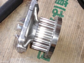 テンショナープーリーとアイドラープーリーも交換したんですが、アイドラープーリーのバネは交換しませんでした。しなくていいんでしょうかねぇ・・・(謎)そしてウォーターポンプもピカピカの新品に交換して組み付け。