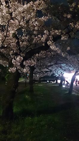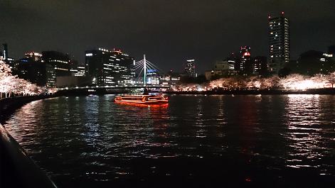 ちょうど桜が満開の時期で大川沿いのライトアップされた桜はとっても綺麗。屋台もいっぱい出ていて、本来ならば多くの花見客で賑わっているんでしょうけど、この日は生憎の雨予報なのか、人はまばらっといった感じ。