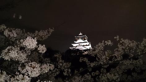大川を離れて大阪城方面へ。こちらも桜が満開できれいです。ライトアップされた大阪城が暗闇に浮き上がっていて存在感を示しています。