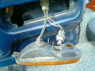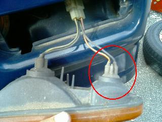 ②ねじを緩めると、ウインカーレンズが前方に外せます。ウインカー用の配線(左側)と車幅灯用の配線(右側)がみえます。今回は車幅灯の交換なので、右側のソケットをウインカーレンズからはずします。はずすときは、ソケットを少し回して引くだけです。