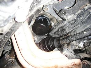 オイルフィルター取り付け部とドレンボルトのところを洗浄して新品のフィルターとドレンボルトを取り付け。オイルフィルター取り付け時は黒いゴムのパッキンの所に軽くオイルを塗っておくのがポイントです。
