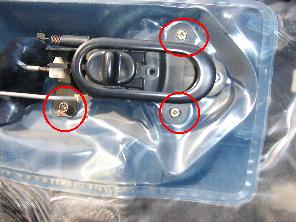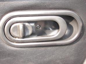 とりあえず、ドアの内張りを外します。ドアノブの受け皿(名前が分かりません…)を留めているネジを外して、これを取り外します。