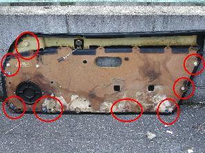 専用の工具を使う部位は左の写真の赤丸の位置辺りです。ただし、この車は前のオーナーのいじり方が悪かったのか何箇所かは止まってなかったので、本当はもっと工具を使う箇所がありそうです。とりあえずこれで内装の取り外しは完了。