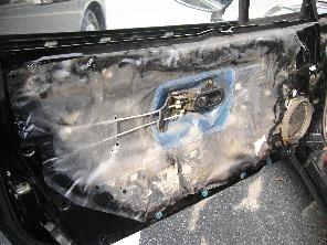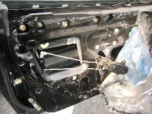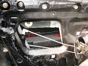 防水シートを外したら大きな穴が見えます。この穴の両サイドに見える支柱(赤矢印)がパワーウィンドウのアームです。