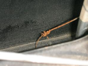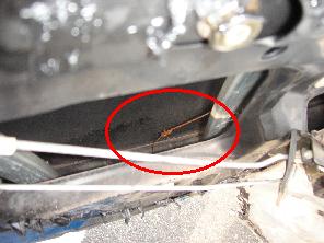 この穴を上から覗くと・・・、何か錆錆で切れ掛かっているものを発見(赤丸)拡大すると明らか。ウィンドウを上げ下げするためのワイヤーです。モーターは動いているようなので、おそらくこのワイヤーのトラブルによってモーターの力が伝わってなかったのでしょう。ということでワイヤーを注文して自分で直そ♪モーターは詳しくチェックしませんでしたが、おそらく大丈夫でしょう(笑)