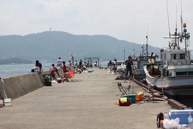 釣り場についたのは10時前くらい。ボツボツと釣り人がいましたが、暑さの為か大混雑といった感じではありません。さっそく波止場先端付近で釣り開始。
