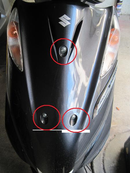 まずはフロントカウルを外します。大きめのプラスドライバーでフロントに見える3つのネジを外します。結構硬かったので、自分はショックドライバー