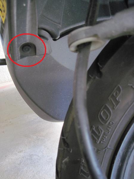 フロントカウルの下側にはプッシュリベットが左右1つずつ、計2つあります。タイヤの後ろ側くらいですね。これは真ん中をドライバーなどで強く押すだけでOKです。傷が入らないようにドライバーをウエスかなにかで包んで押すといいようです。