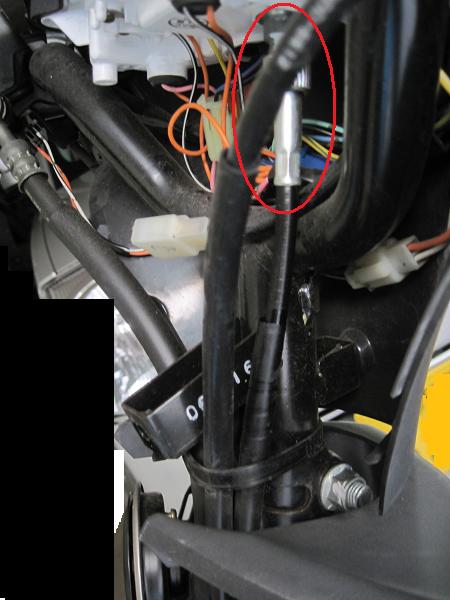 スピードメーターケーブルの長さに余裕がないので、どのように走行しているかしっかりと確認しておきましょう。こちらがスピードメーター側。下の方でブレーキホース等と一緒に束ねられていますね。