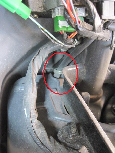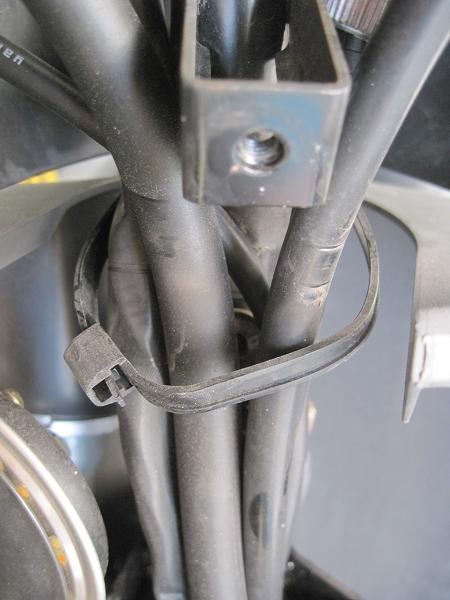 スピードメーターケーブルの位置を確認したらあとはとりはずして交換するだけ。取り外す際にケーブル類を束ねている上側のタイラップはゆるめて、下側のタイラップは使い捨てタイプだったので切断しました。